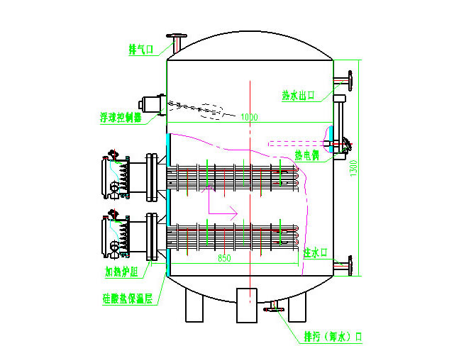 提高熱媒與被加熱水的流述,變層流換熱為紊流換熱。充分利用罐體內(nèi)初次加熱時(shí)冷、熱水之密度差,使其形成自然循環(huán)將罐體底部的冷水加熱。